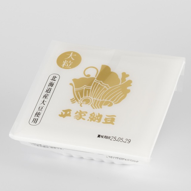 大粒の北海道大豆使用 大粒納豆はスーパーではなかなか見ない商品です。 納豆好きには一度食べてもらいたい一品です。無添加のたれ・和辛子付 # 商品説明文 平家 大粒納豆 平家 大粒納豆は、厳選された国産大豆を使用した、食べ応えのある大粒サイズの納豆です。豊かな風味と食感が特徴で、クリーミーな舌触りが楽しめます。独自の発酵技術によって、納豆の旨味がしっかりと引き出されており、毎日の食卓に欠かせない健康食品としてお役立ていただけます。ご飯に乗せて食べるのはもちろん、サラダや和え物、おつまみとしても大活躍します! ■ カラー/サイズ/バリエーション ・濃厚なクリーム色の大粒 ・便利なパック入り(70g) ・冷凍保存も可能!ストックに便利 ■ 素材/製造国 ・原材料: 大豆(遺伝子組換えでない)、納豆菌 ・製造国: 日本 ■ お手入れ/取り扱い注意事項 ・冷蔵庫で保存し、開封後はお早めにお召し上がりください。 ・冷凍保存が可能ですので、余分な分は冷凍しておくことをおすすめします。 ■ 発送・注文に関する情報や注意事項 ・注文完了後、3〜7日以内に発送いたします。 ・発送時期は混雑状況によって変動することがありますので、ご了承ください。 ■ その他の情報や注意事項 ・アレルギーをお持ちの方は、原材料を確認した上でお召し上がりください。 ご質問や詳しい情報については、ショップのお問い合わせからお気軽にご連絡ください。お客様のご利用を心よりお待ちしております。